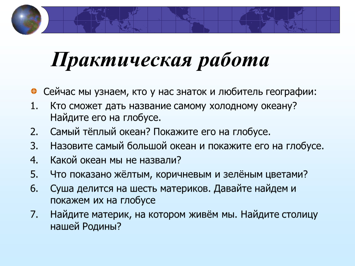 Кто сможет дать название самому холодному океану? Найдите его на глобусе.