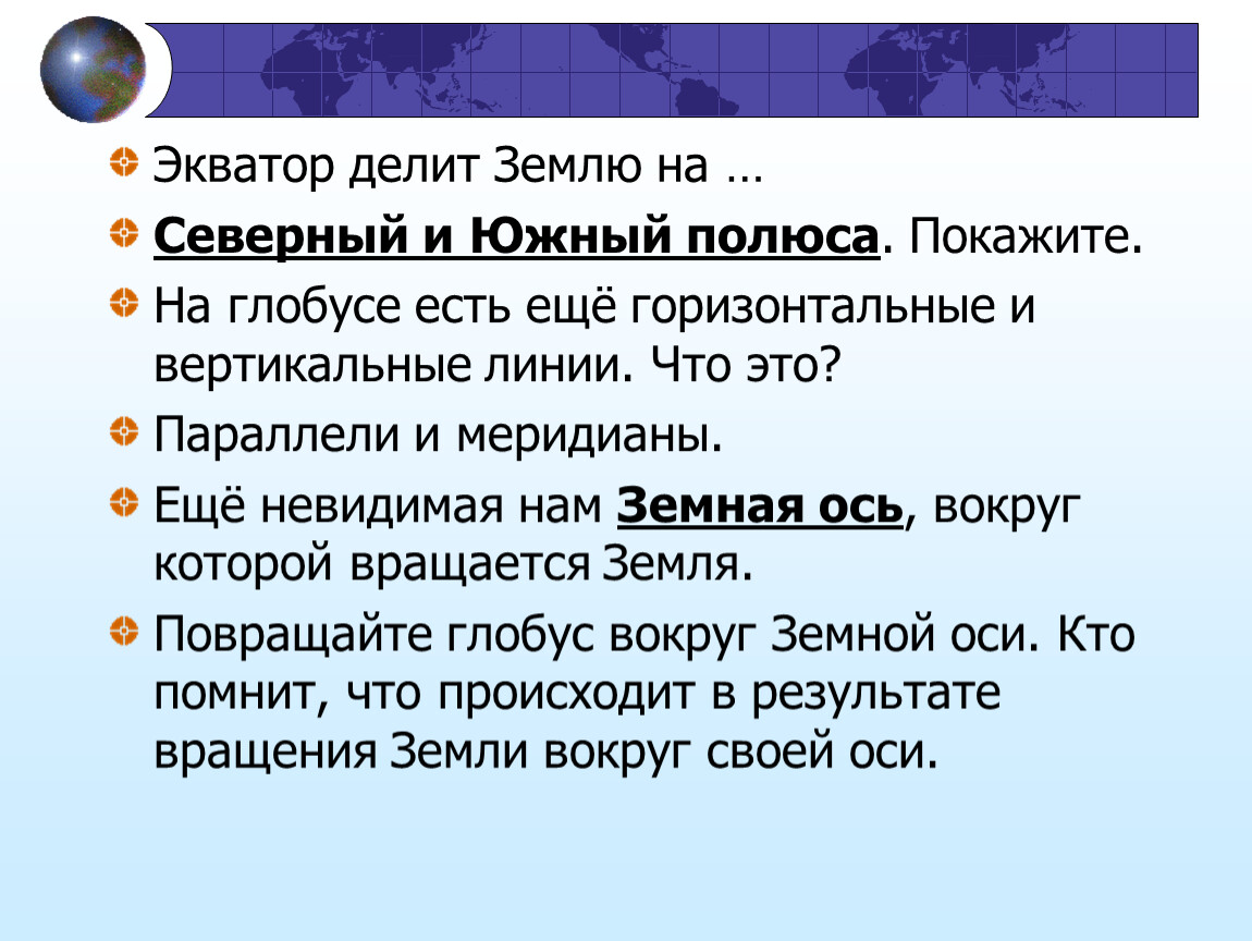 Повращайте глобус вокруг Земной оси. Кто помнит, что происходит в результате вращения Земли вокруг своей оси.