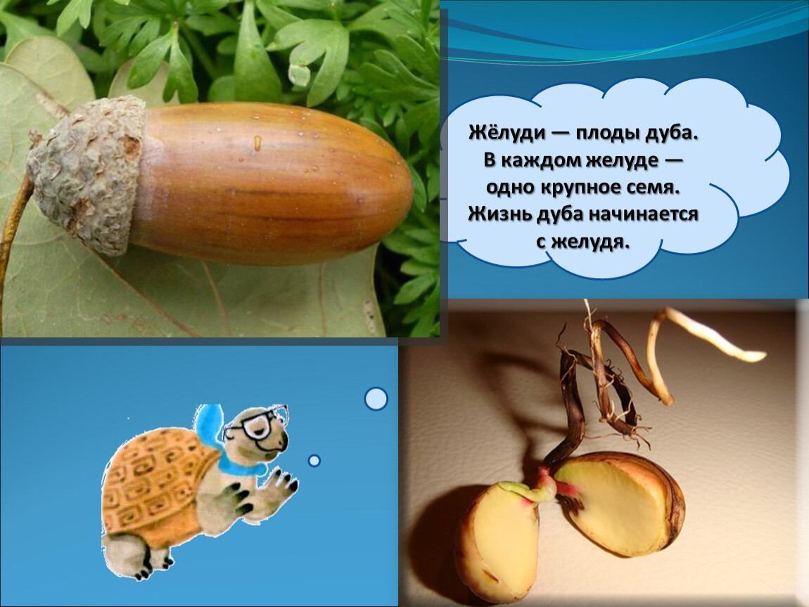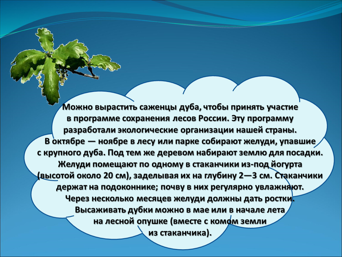 Можно вырастить саженцы дуба, чтобы принять участие в программе сохранения лесов России. Эту программу разработали экологические организации нашей страны. В октябре — ноябре в лесу или парке собирают желуди, упавшие с крупного дуба. Под тем же деревом набирают землю для посадки. Желуди помещают по одному в стаканчики из-под йогурта (высотой около 20 см), заделывая их на глубину 2—3 см. Стаканчики держат на подоконнике; почву в них регулярно увлажняют. Через несколько месяцев желуди должны дать ростки. Высаживать дубки можно в мае или в начале лета на лесной опушке (вместе с комом земли из стаканчика).