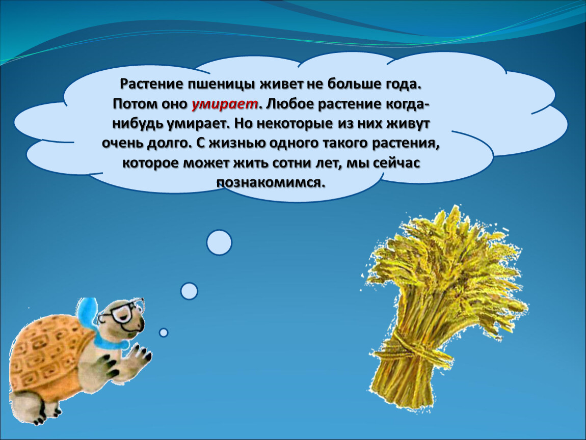 Растение пшеницы живет не больше года. Потом оно умирает. Любое растение когда-нибудь умирает. Но некоторые из них живут очень долго. С жизнью одного такого растения, которое может жить сотни лет, мы сейчас познакомимся.
