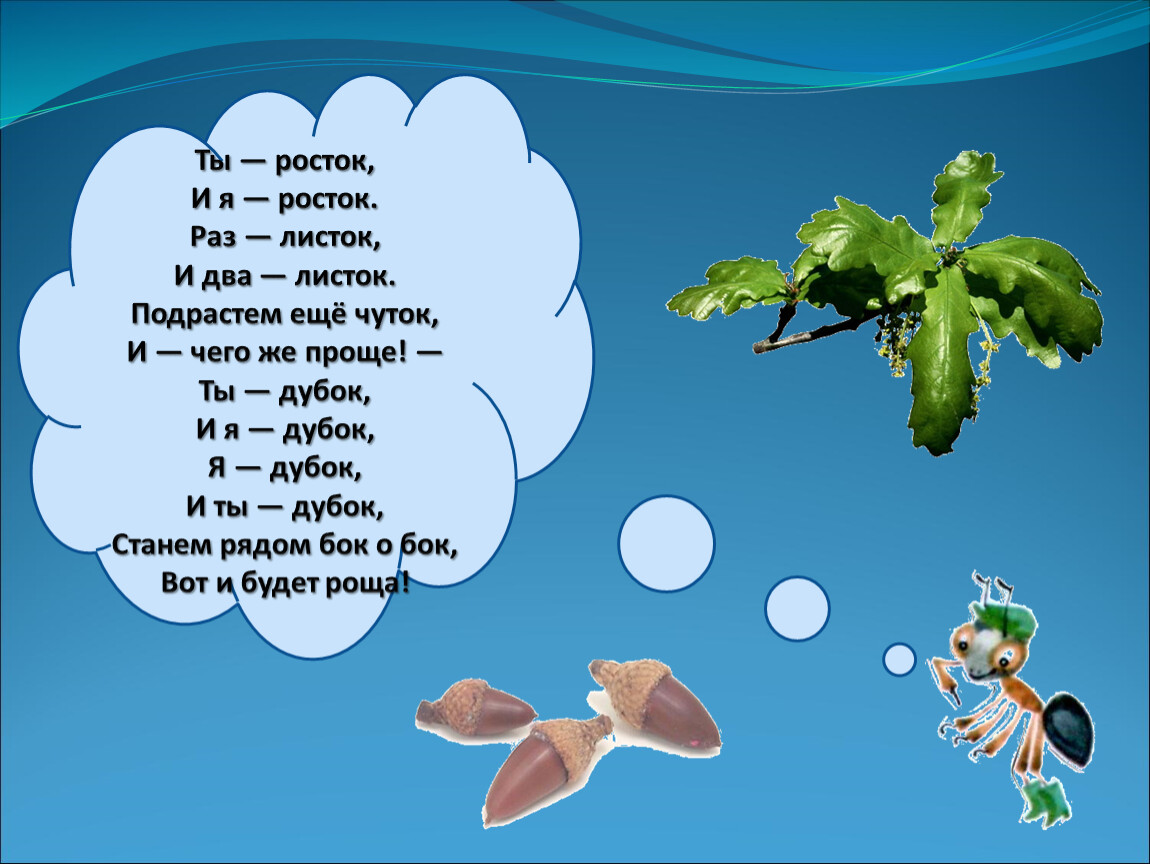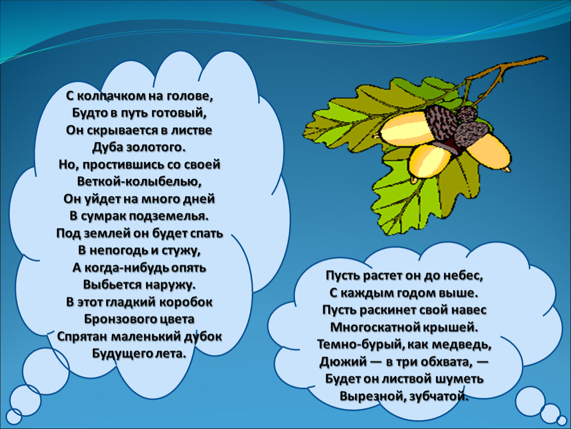 С колпачком на голове,Будто в путь готовый,Он скрывается в листвеДуба золотого.Но, простившись со своейВеткой-колыбелью,Он уйдет на много днейВ сумрак подземелья.Под землей он будет спатьВ непогодь и стужу,А когда-нибудь опятьВыбьется наружу.В этот гладкий коробокБронзового цветаСпрятан маленький дубокБудущего лета.