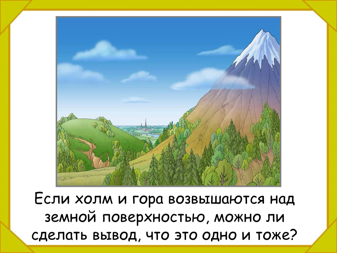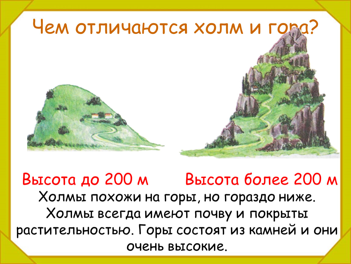 Холмы похожи на горы, но гораздо ниже. Холмы всегда имеют почву и покрыты растительностью. Горы состоят из камней и они очень высокие.