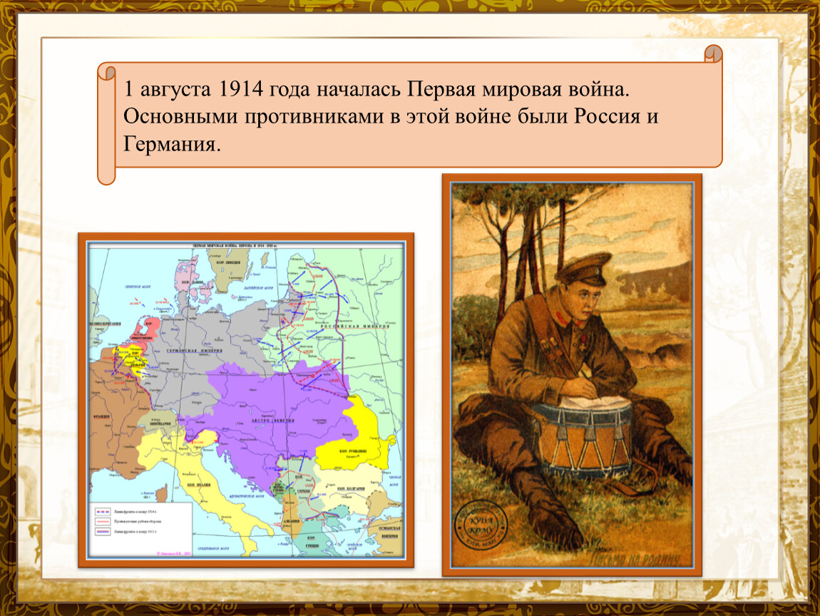1 августа 1914 года началась Первая мировая война. Основными противниками в этой войне были Россия и Германия.