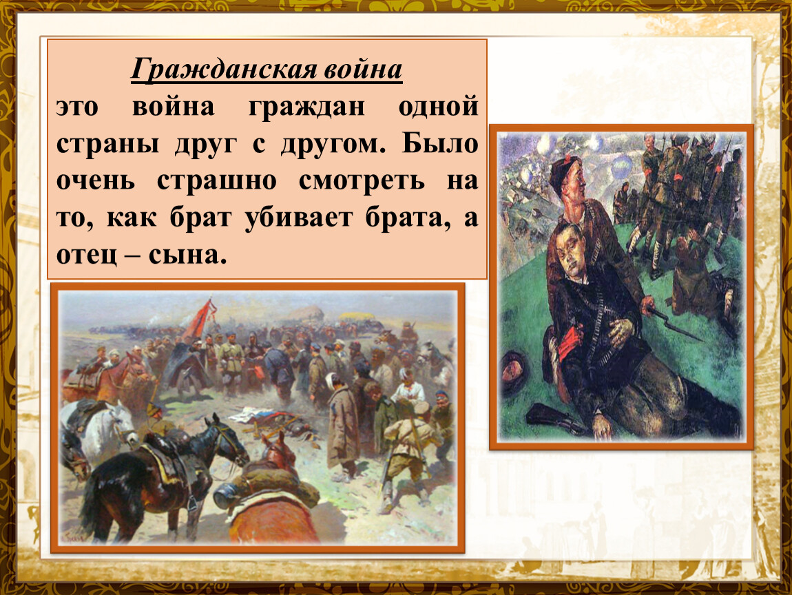 это война граждан одной страны друг с другом. Было очень страшно смотреть на то, как брат убивает брата, а отец – сына.