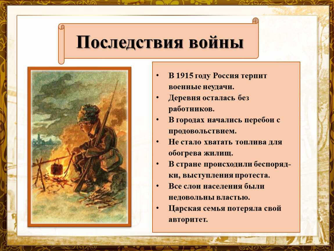 В 1915 году Россия начала терпеть военные неудачи. Русская армия оказалась без снарядов, винтовок, сапог. Деревня осталась без работников. Зимой не хватало топлива.