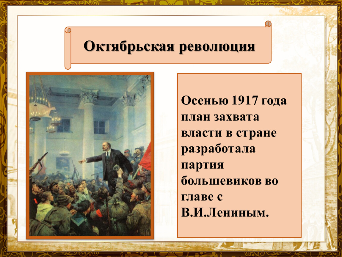 Осенью 1917 года план захвата власти в стране разработала партия большевиков во главе с В.И.Лениным.