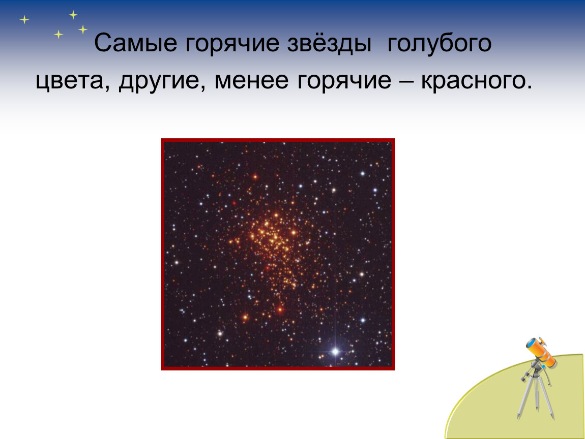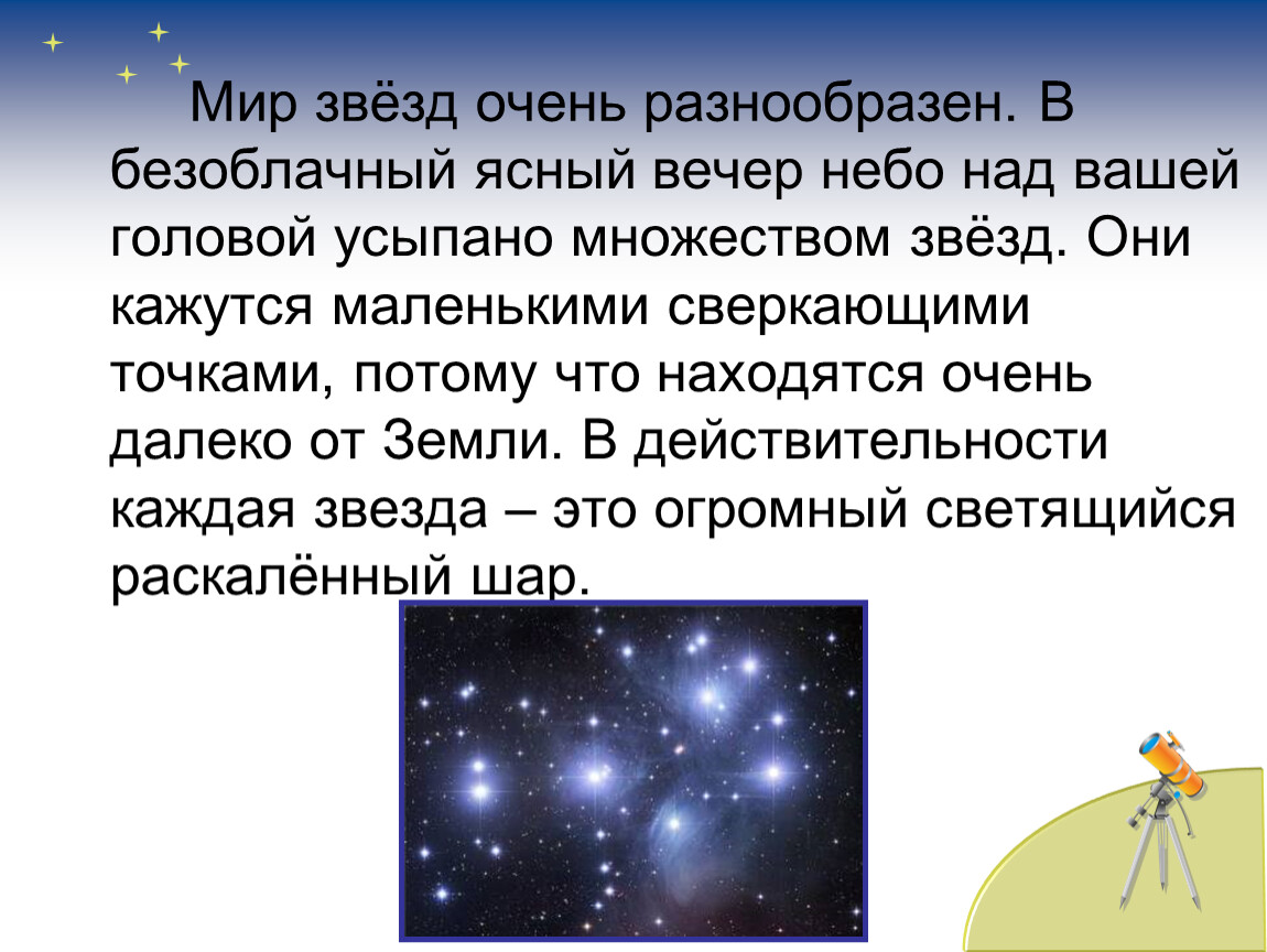 Мир звёзд очень разнообразен. В безоблачный ясный вечер небо над вашей головой усыпано множеством звёзд. Они кажутся маленькими сверкающими точками, потому что находятся очень далеко от Земли. В действительности каждая звезда – это огромный светящийся раскалённый шар.