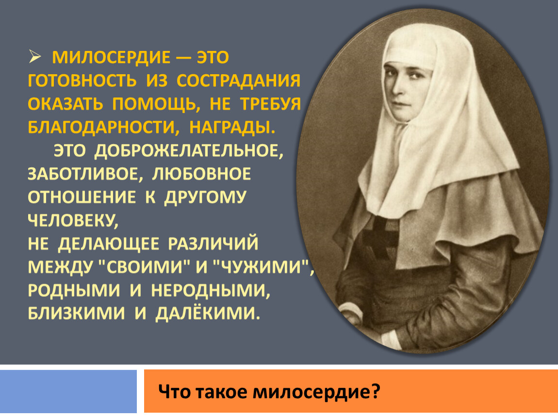 Милосердие — это готовность из сострадания оказать помощь, не требуя благодарности, награды. Это доброжелательное, заботливое, любовное отношение к другому человеку, Не делающее различий между "своими" и "чужими", родными и неродными, близкими и далёкими.