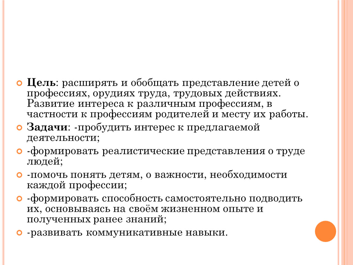 Цель: расширять и обобщать представление детей о профессиях, орудиях труда, трудовых действиях. Развитие интереса к различным профессиям, в частности к профессиям родителей и месту их работы.
