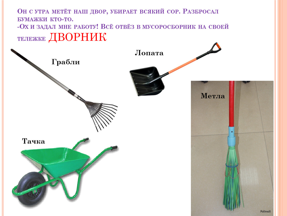 Он с утра метёт наш двор, убирает всякий сор. Разбросал бумажки кто-то.-Ох и задал мне работу! Всё отвёз в мусоросборник на своей тележке ДВОРНИК