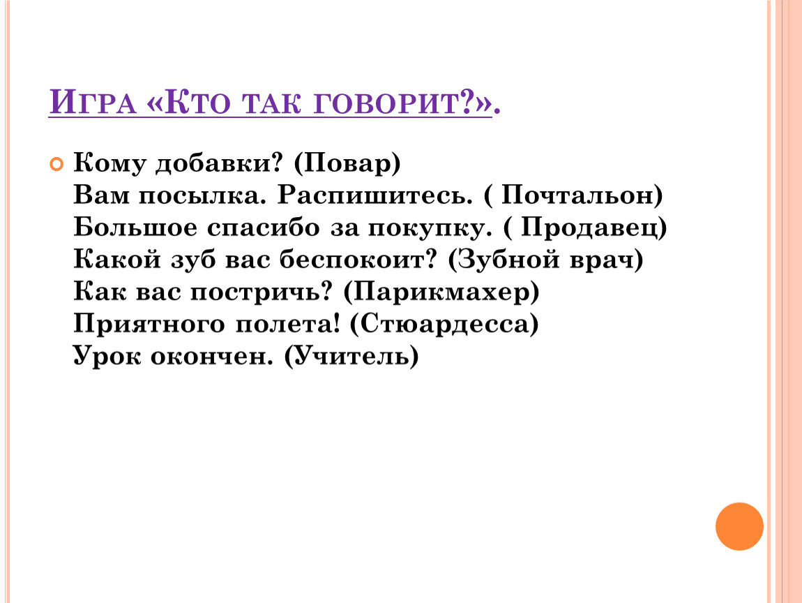 Кому добавки? (Повар)Вам посылка. Распишитесь. ( Почтальон)Большое спасибо за покупку. ( Продавец)Какой зуб вас беспокоит? (Зубной врач)Как вас постричь? (Парикмахер)Приятного полета! (Стюардесса)Урок окончен. (Учитель)