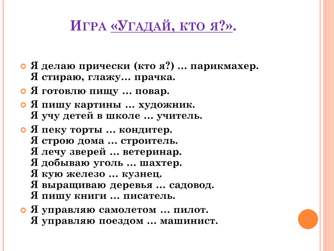 Я делаю прически (кто я?) … парикмахер.Я стираю, глажу… прачка.