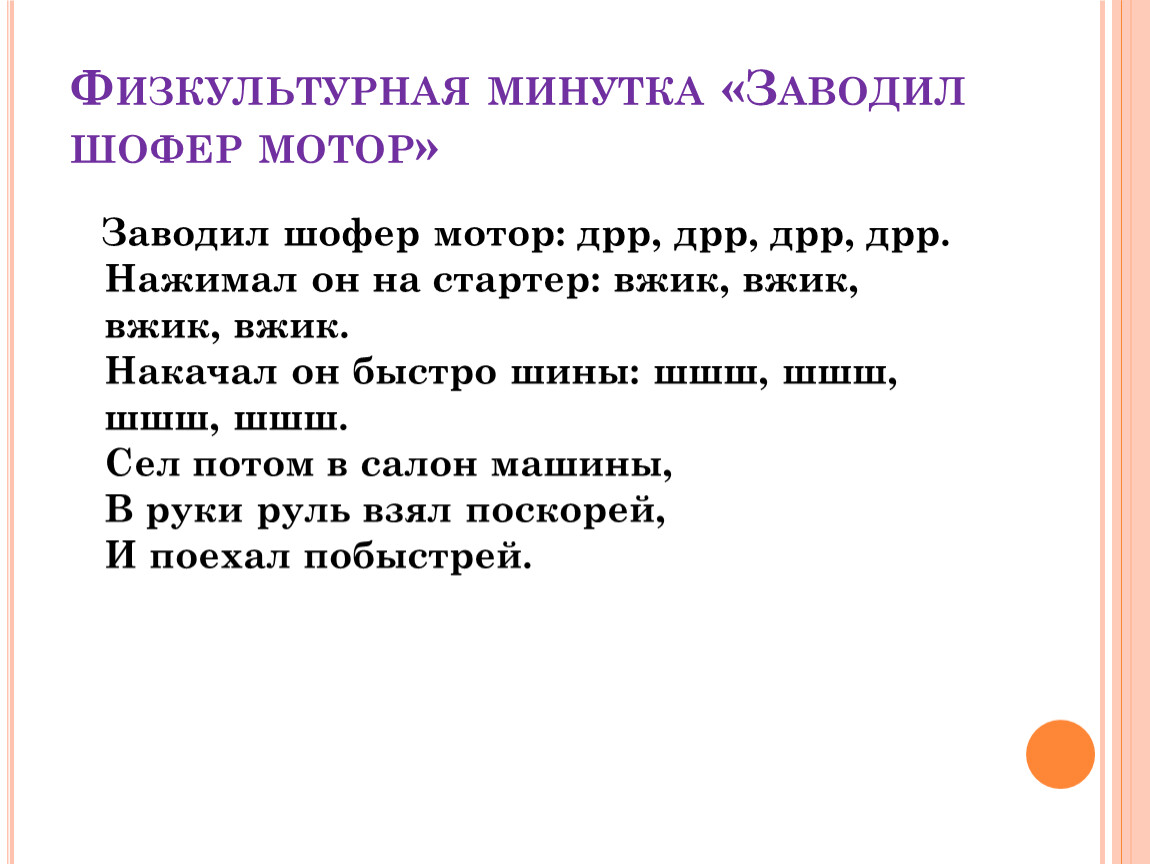 Заводил шофер мотор: дрр, дрр, дрр, дрр.Нажимал он на стартер: вжик, вжик, вжик, вжик.Накачал он быстро шины: шшш, шшш, шшш, шшш.Сел потом в салон машины,В руки руль взял поскорей,И поехал побыстрей.