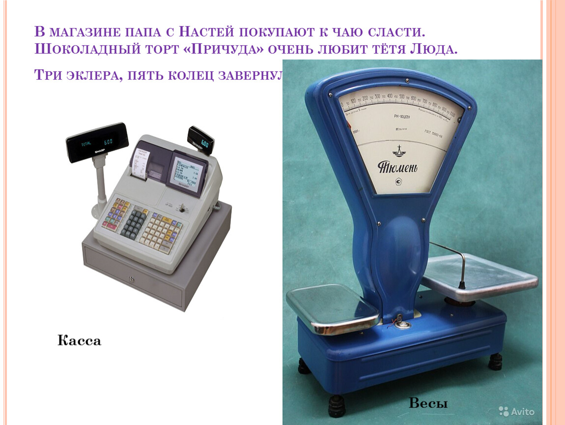 В магазине папа с Настей покупают к чаю сласти. Шоколадный торт «Причуда» очень любит тётя Люда. Три эклера, пять колец завернул им ПРОДАВЕЦ