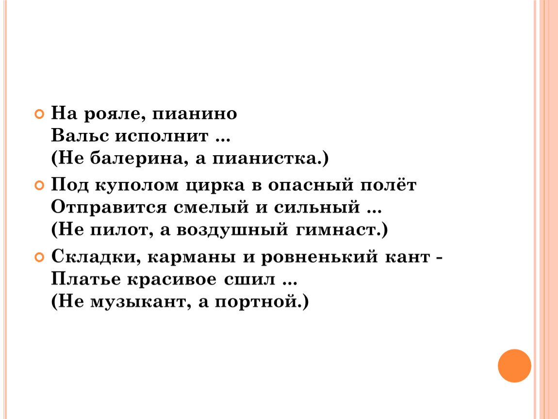 Складки, карманы и ровненький кант -Платье красивое сшил ...(Не музыкант, а портной.)