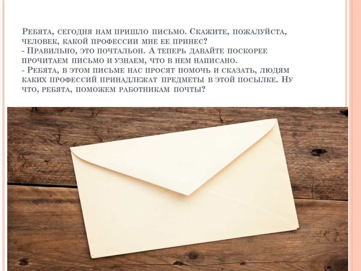 Ребята, сегодня нам пришло письмо. Скажите, пожалуйста, человек, какой профессии мне ее принес? - Правильно, это почтальон. А теперь давайте поскорее прочитаем письмо и узнаем, что в нем написано.- Ребята, в этом письме нас просят помочь и сказать, людям каких профессий принадлежат предметы в этой посылке. Ну что, ребята, поможем работникам почты?