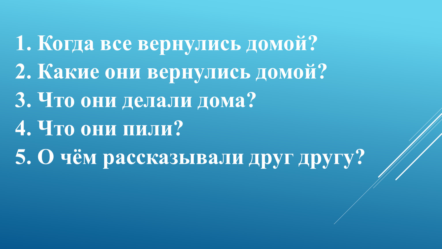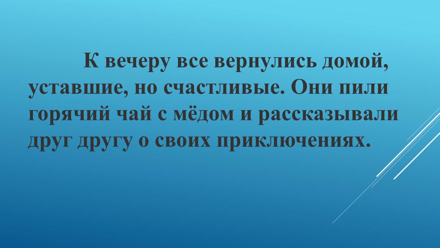 К вечеру все вернулись домой, уставшие, но счастливые. Они пили горячий чай с мёдом и рассказывали друг другу о своих приключениях.