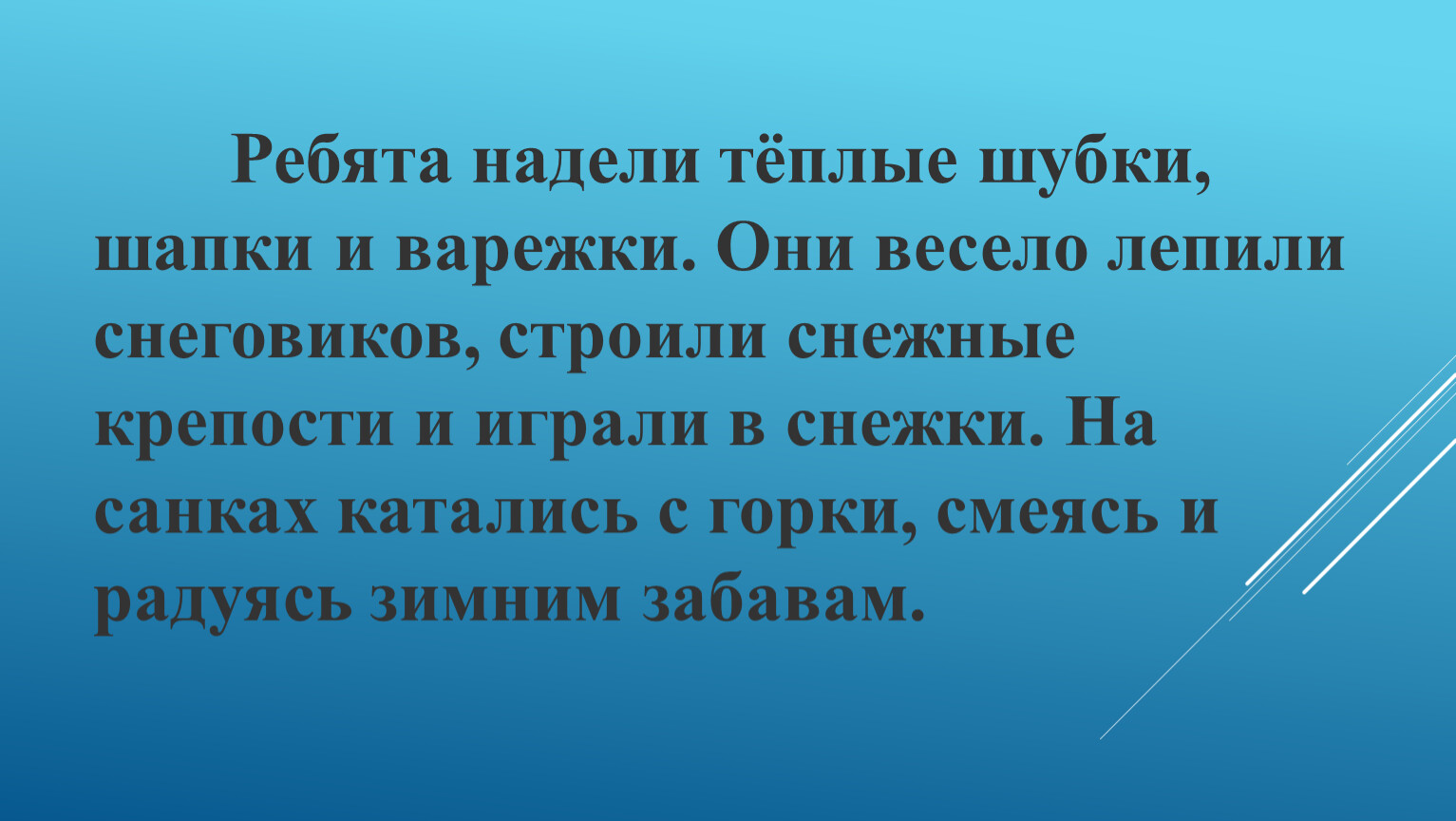 Ребята надели тёплые шубки, шапки и варежки. Они весело лепили снеговиков, строили снежные крепости и играли в снежки. На санках катались с горки, смеясь и радуясь зимним забавам.