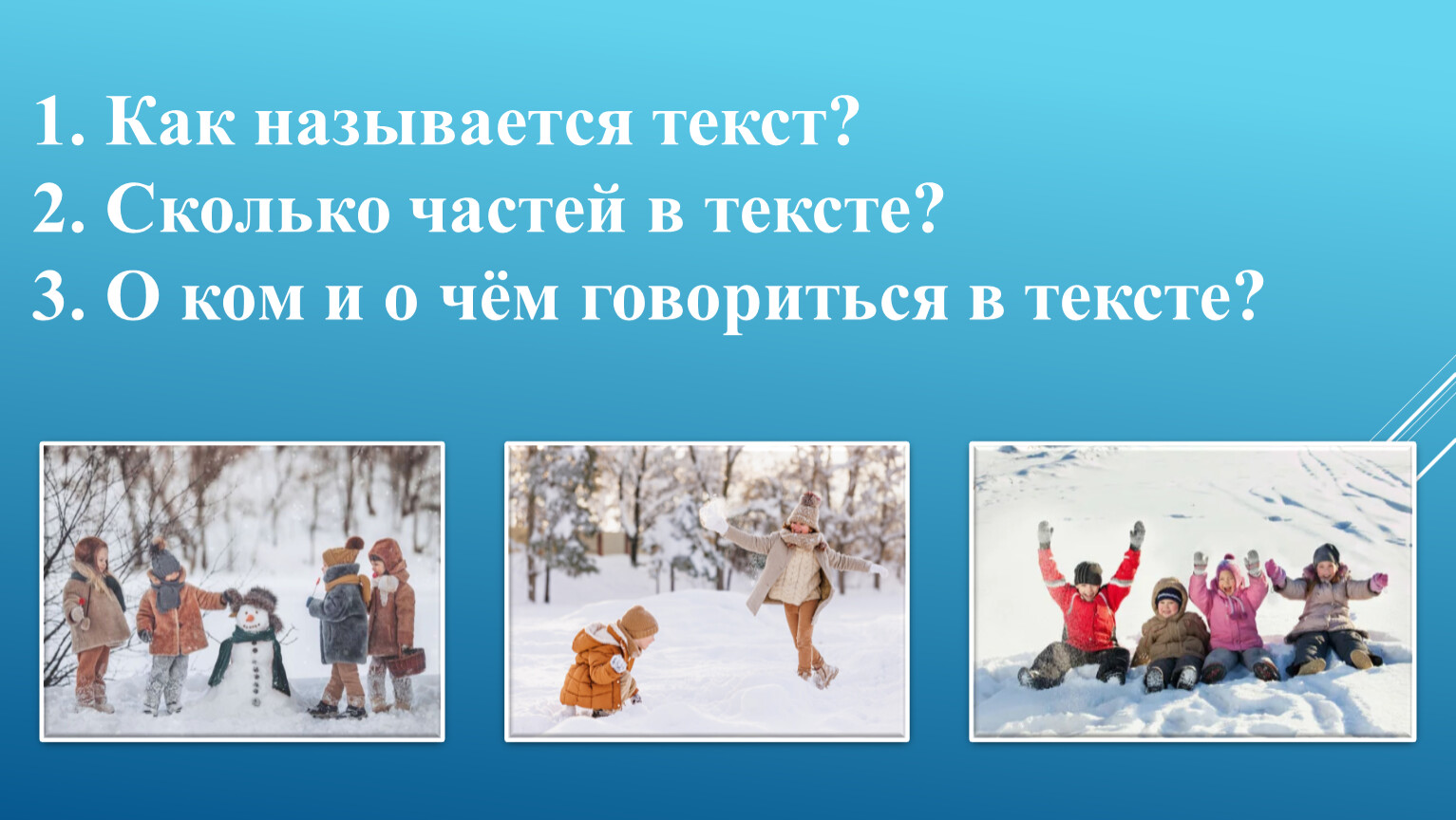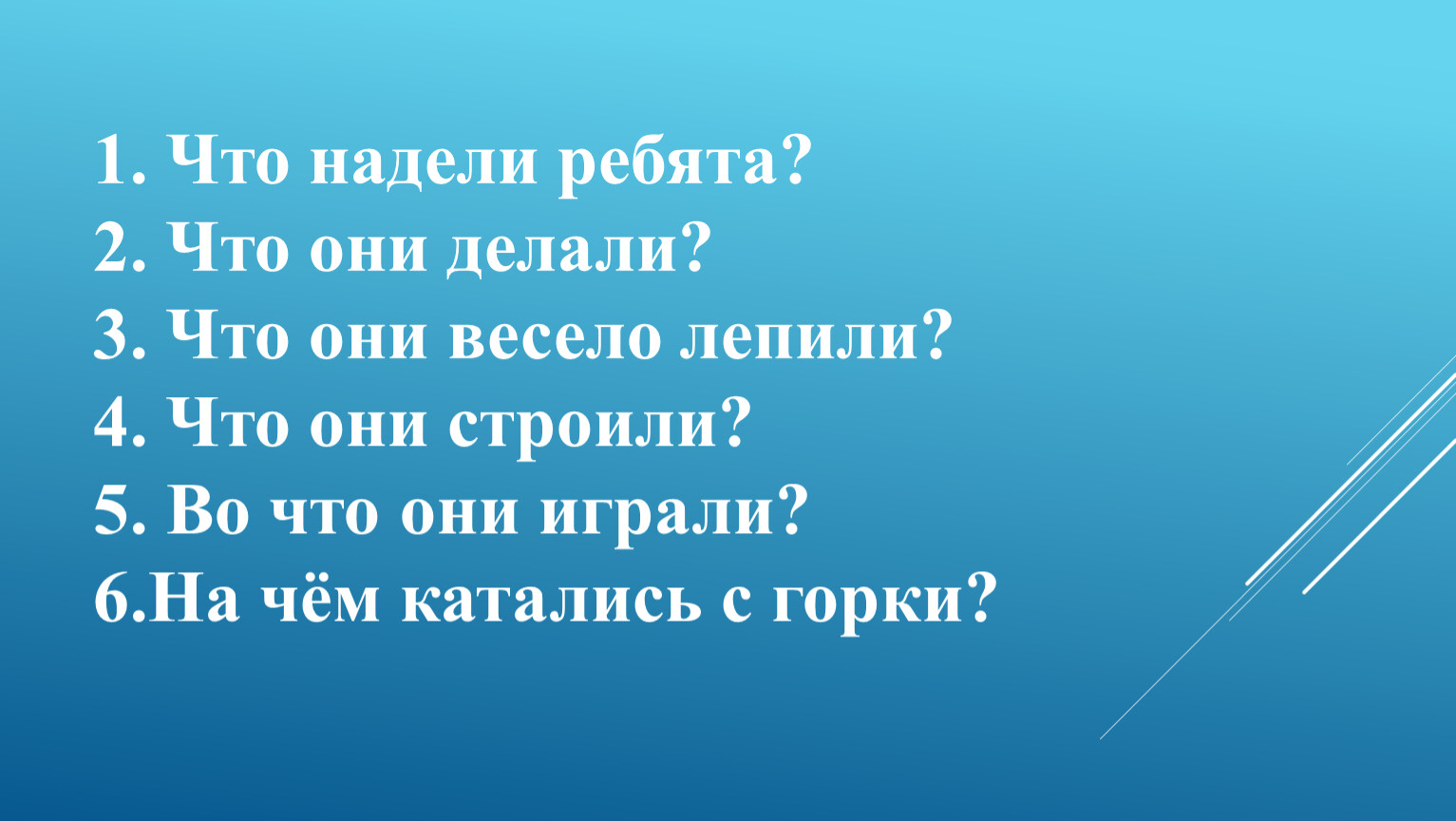 1. Что надели ребята?2. Что они делали?3. Что они весело лепили?4. Что они строили?5. Во что они играли?6.На чём катались с горки?