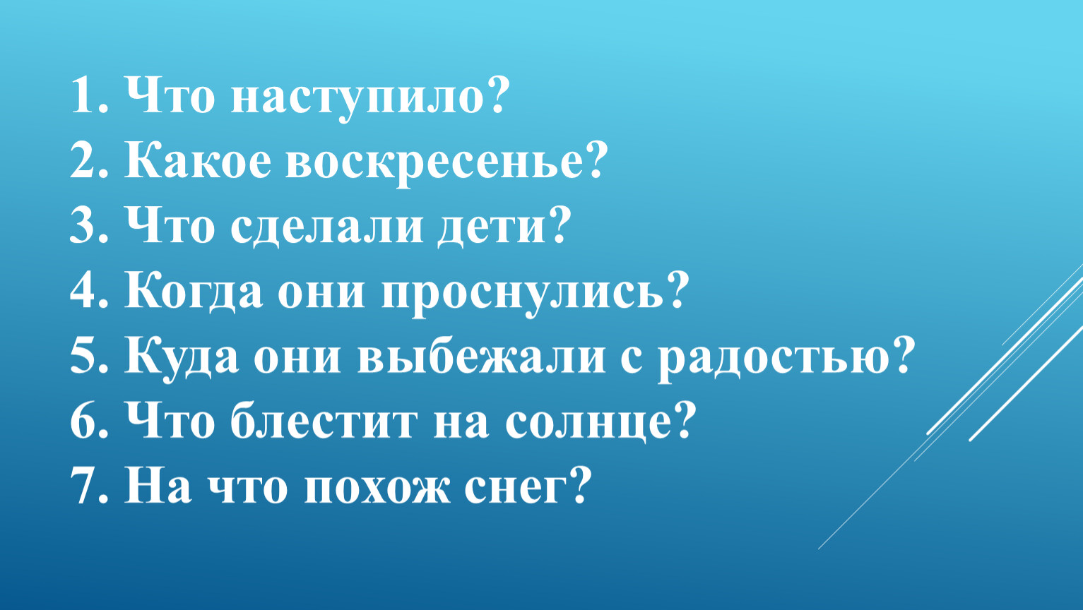 1. Что наступило?2. Какое воскресенье?3. Что сделали дети?4. Когда они проснулись?5. Куда они выбежали с радостью?6. Что блестит на солнце?7. На что похож снег?