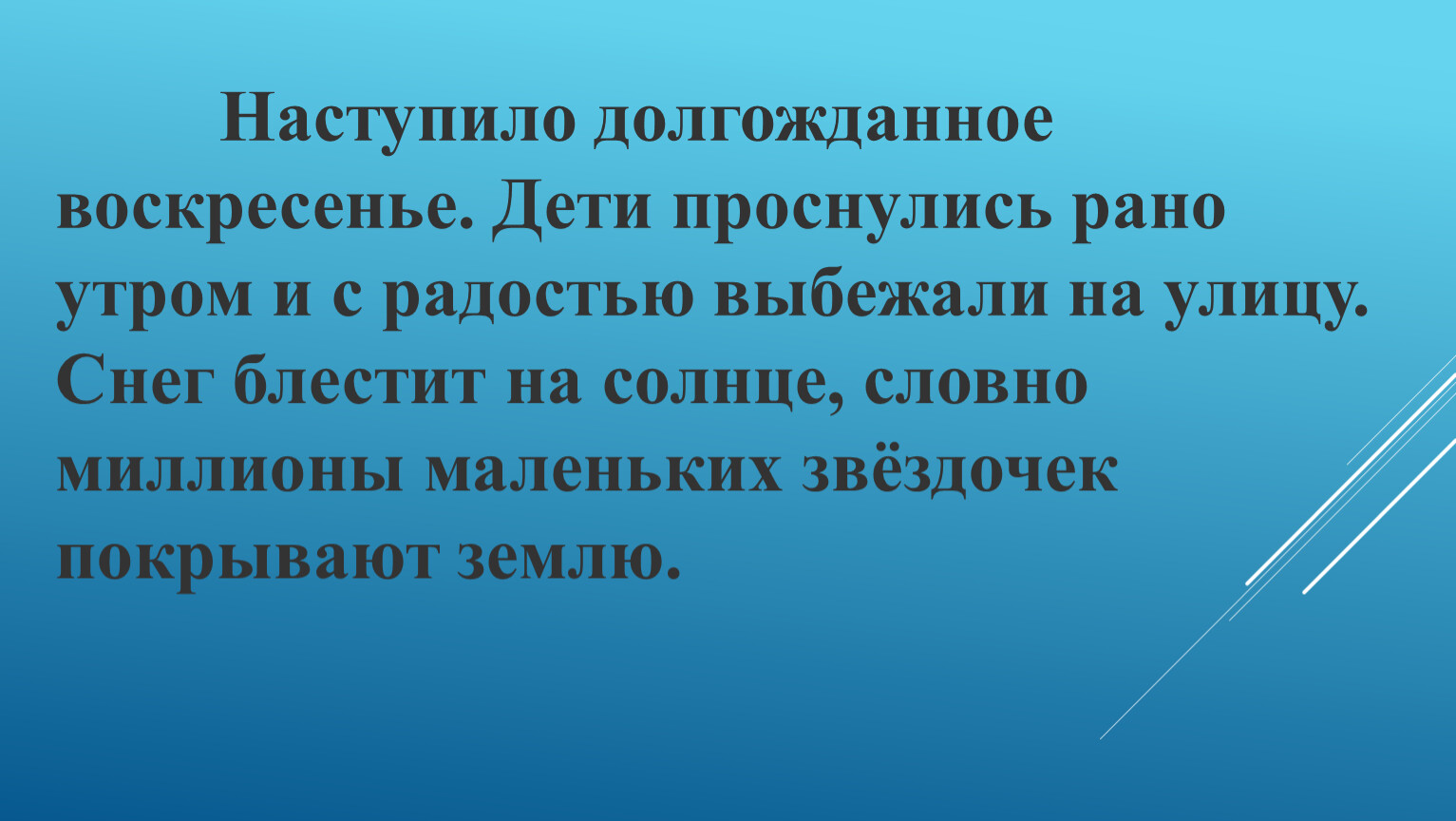Наступило долгожданное воскресенье. Дети проснулись рано утром и с радостью выбежали на улицу. Снег блестит на солнце, словно миллионы маленьких звёздочек покрывают землю.