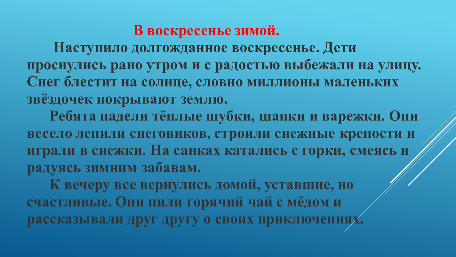 В воскресенье зимой. Наступило долгожданное воскресенье. Дети проснулись рано утром и с радостью выбежали на улицу. Снег блестит на солнце, словно миллионы маленьких звёздочек покрывают землю. Ребята надели тёплые шубки, шапки и варежки. Они весело лепили снеговиков, строили снежные крепости и играли в снежки. На санках катались с горки, смеясь и радуясь зимним забавам. К вечеру все вернулись домой, уставшие, но счастливые. Они пили горячий чай с мёдом и рассказывали друг другу о своих приключениях.
