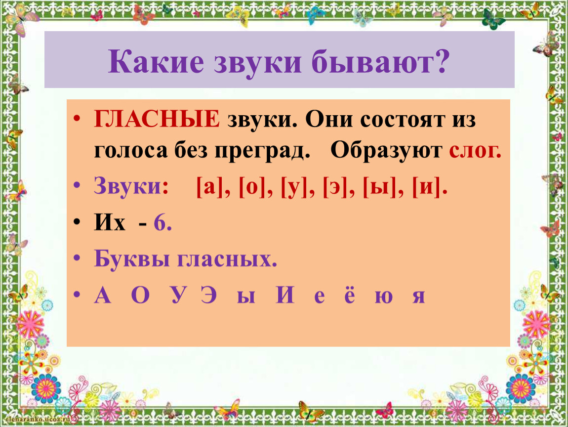 ГЛАСНЫЕ звуки. Они состоят из голоса без преград. Образуют слог.