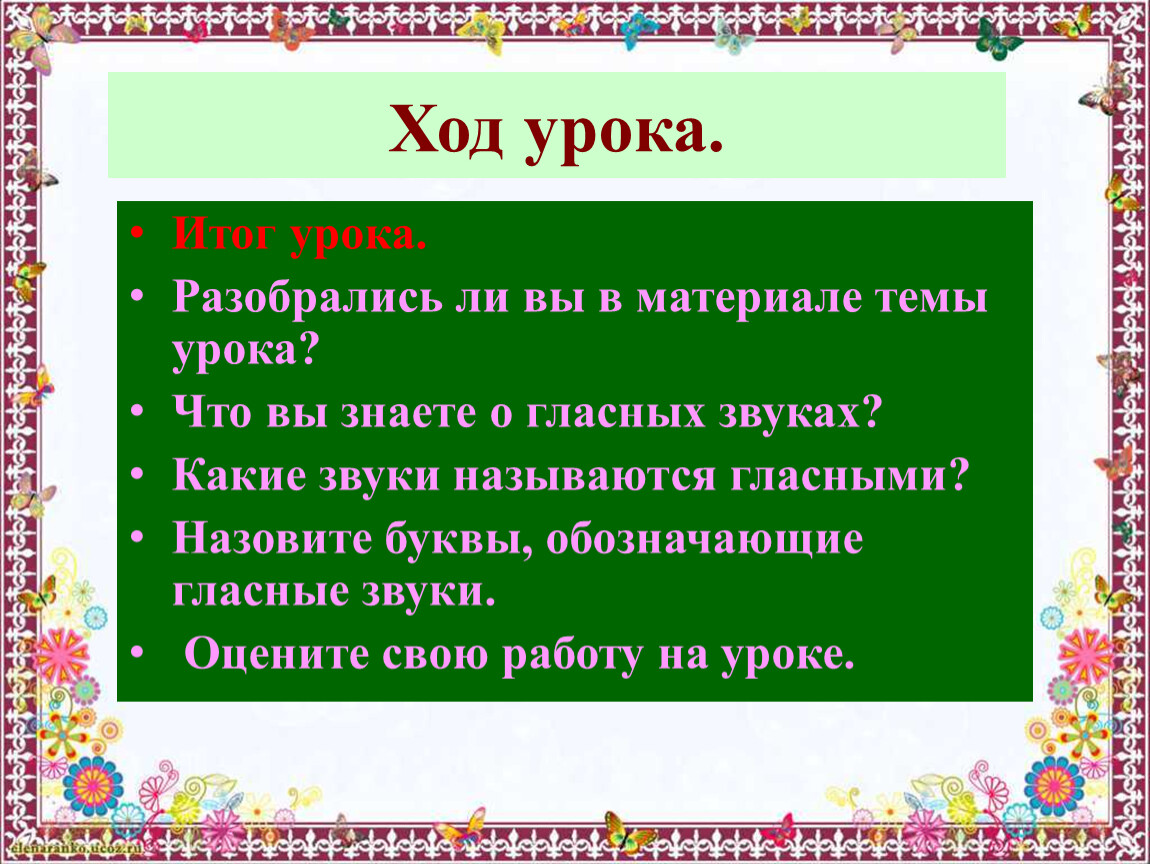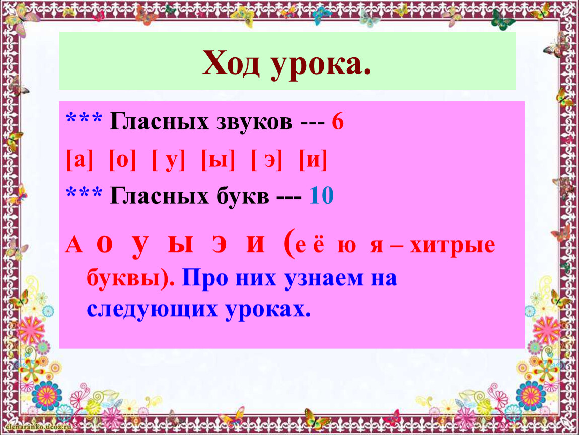 А о у ы э и (е ё ю я – хитрые буквы). Про них узнаем на следующих уроках.