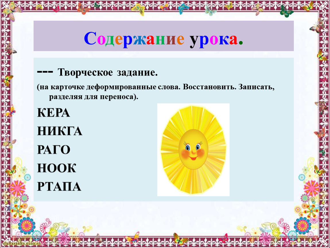 (на карточке деформированные слова. Восстановить. Записать, разделяя для переноса).