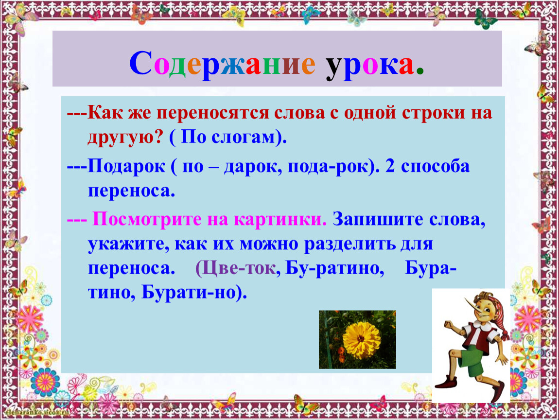--- Посмотрите на картинки. Запишите слова, укажите, как их можно разделить для переноса. (Цве-ток, Бу-ратино, Бура-тино, Бурати-но).