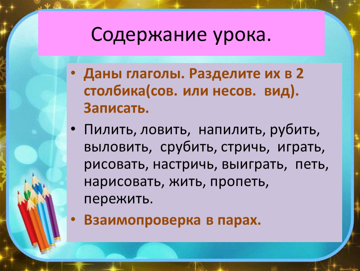 Даны глаголы. Разделите их в 2 столбика(сов. или несов. вид). Записать.