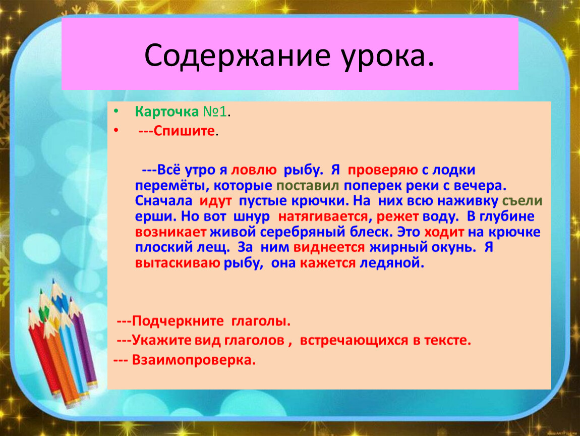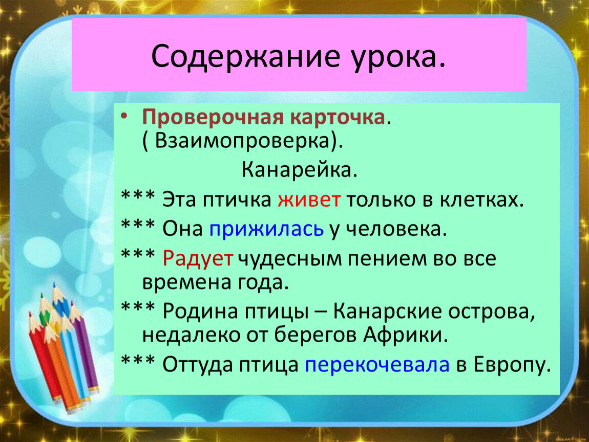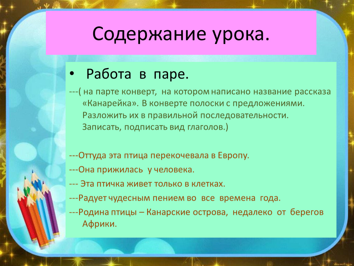 ---( на парте конверт, на котором написано название рассказа «Канарейка». В конверте полоски с предложениями. Разложить их в правильной последовательности. Записать, подписать вид глаголов.)