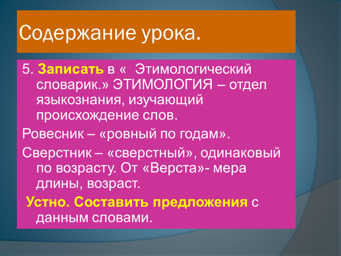 5. Записать в « Этимологический словарик.» ЭТИМОЛОГИЯ – отдел языкознания, изучающий происхождение слов.