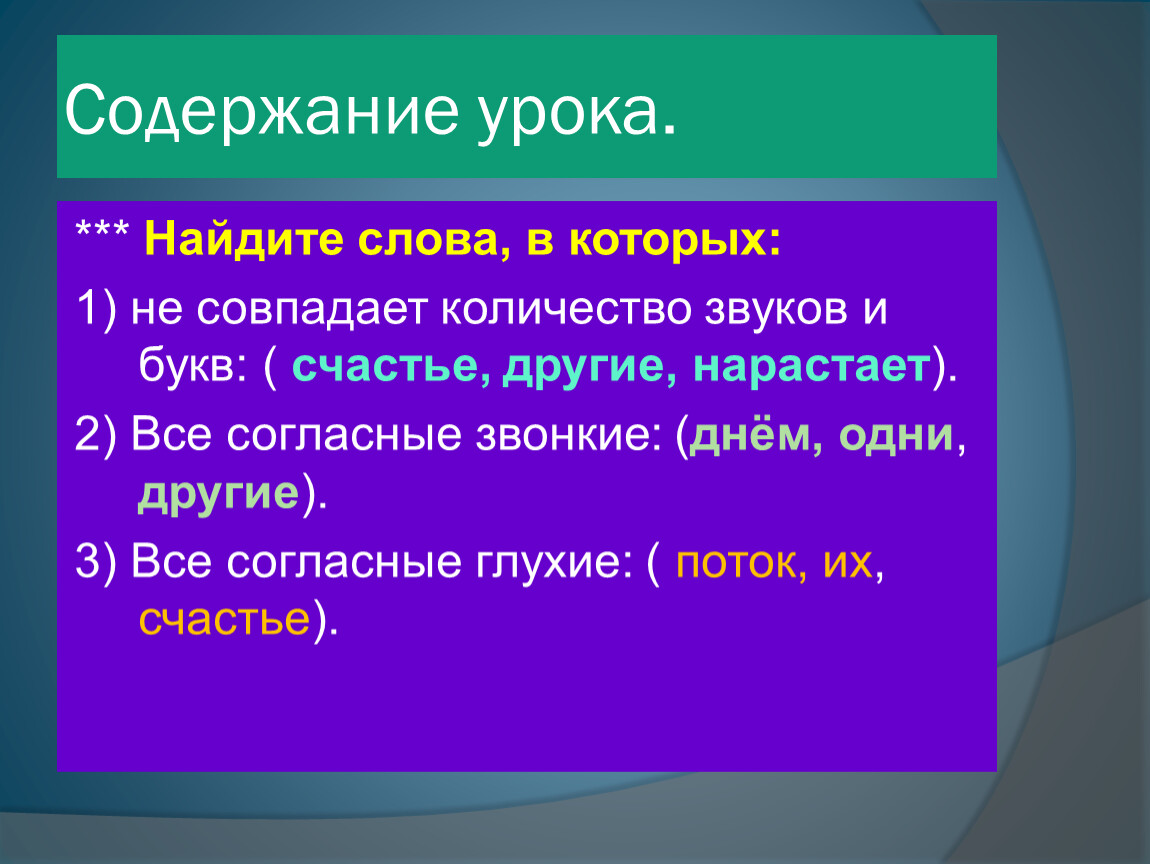 1) не совпадает количество звуков и букв: ( счастье, другие, нарастает).