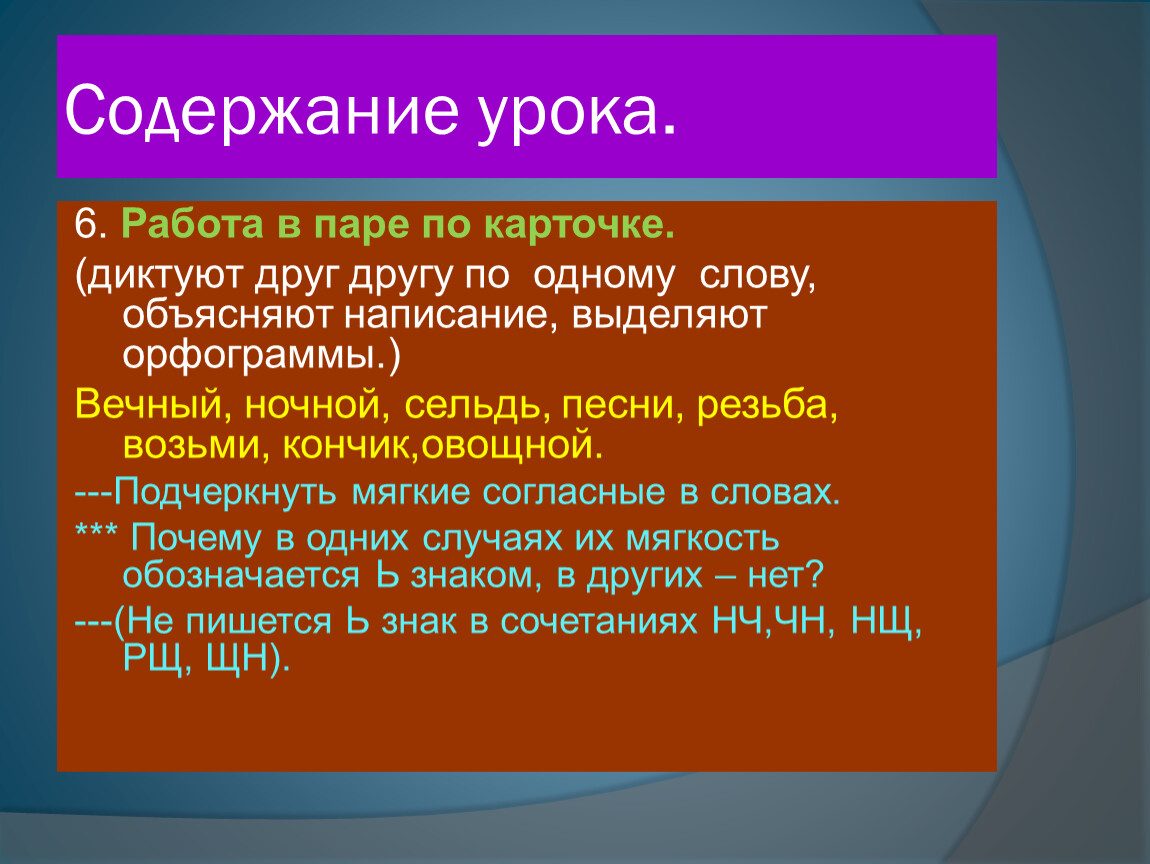 ---(Не пишется Ь знак в сочетаниях НЧ,ЧН, НЩ, РЩ, ЩН).