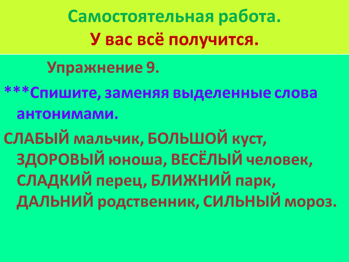 СЛАБЫЙ мальчик, БОЛЬШОЙ куст, ЗДОРОВЫЙ юноша, ВЕСЁЛЫЙ человек, СЛАДКИЙ перец, БЛИЖНИЙ парк, ДАЛЬНИЙ родственник, СИЛЬНЫЙ мороз.