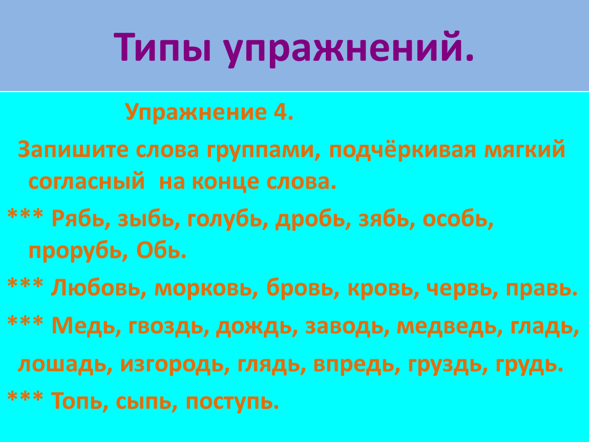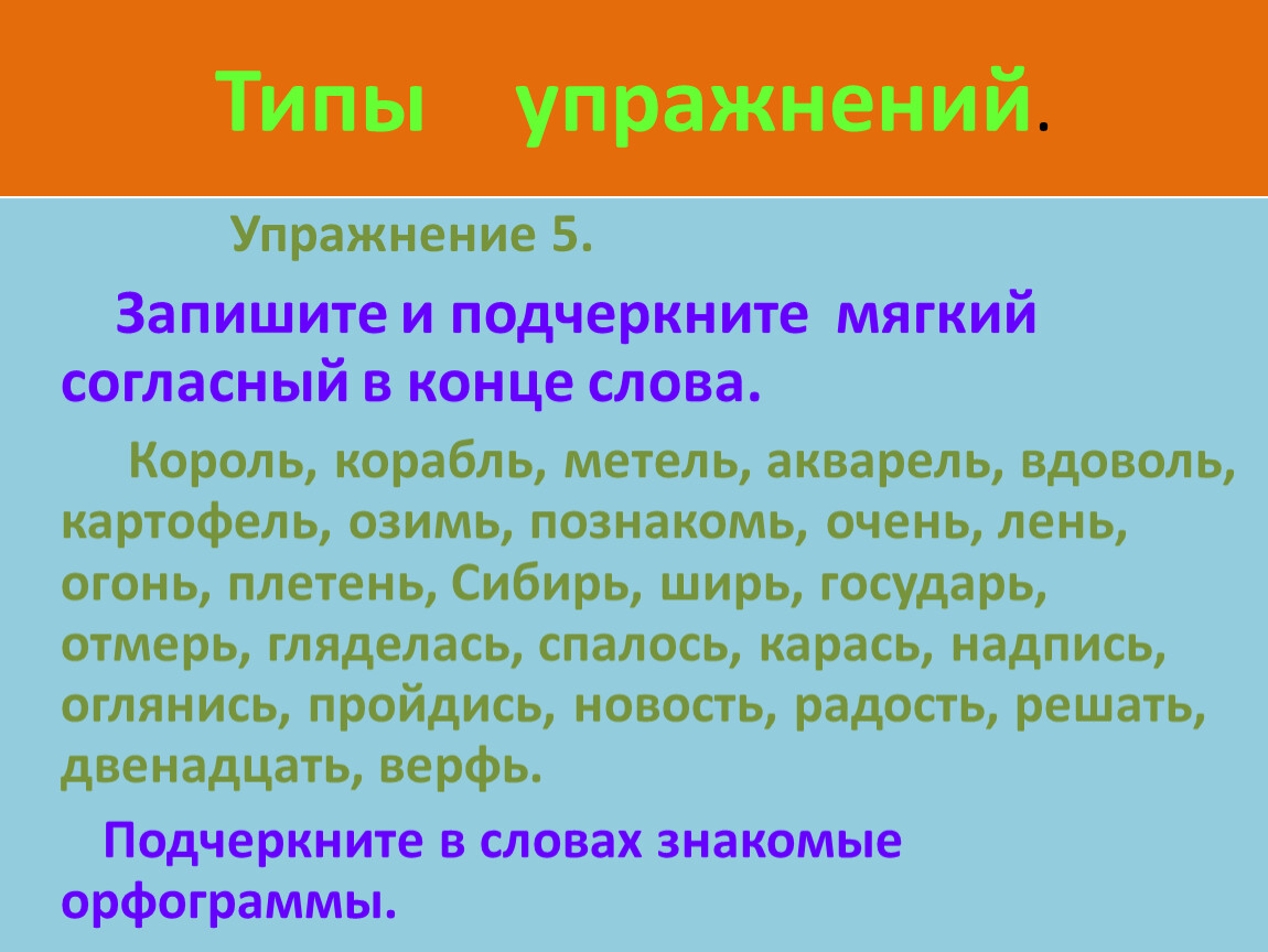 Король, корабль, метель, акварель, вдоволь, картофель, озимь, познакомь, очень, лень, огонь, плетень, Сибирь, ширь, государь, отмерь, гляделась, спалось, карась, надпись, оглянись, пройдись, новость, радость, решать, двенадцать, верфь.