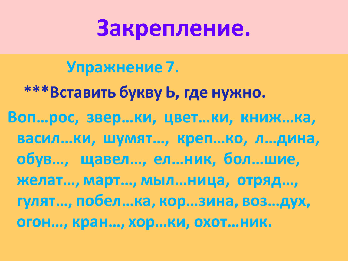 Воп…рос, звер…ки, цвет…ки, книж…ка, васил…ки, шумят…, креп…ко, л…дина, обув…, щавел…, ел…ник, бол…шие, желат…, март…, мыл…ница, отряд…, гулят…, побел…ка, кор…зина, воз…дух, огон…, кран…, хор…ки, охот…ник.