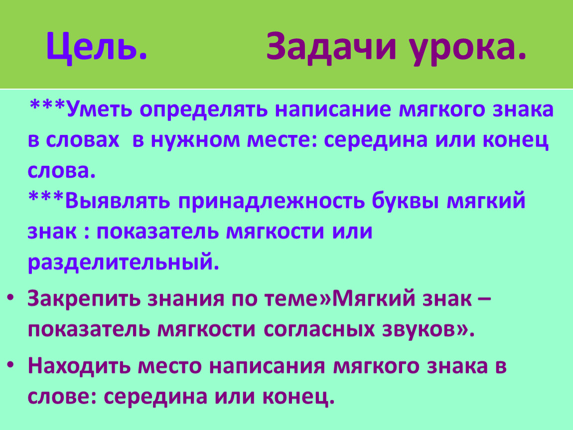 ***Уметь определять написание мягкого знака в словах в нужном месте: середина или конец слова. ***Выявлять принадлежность буквы мягкий знак : показатель мягкости или разделительный.