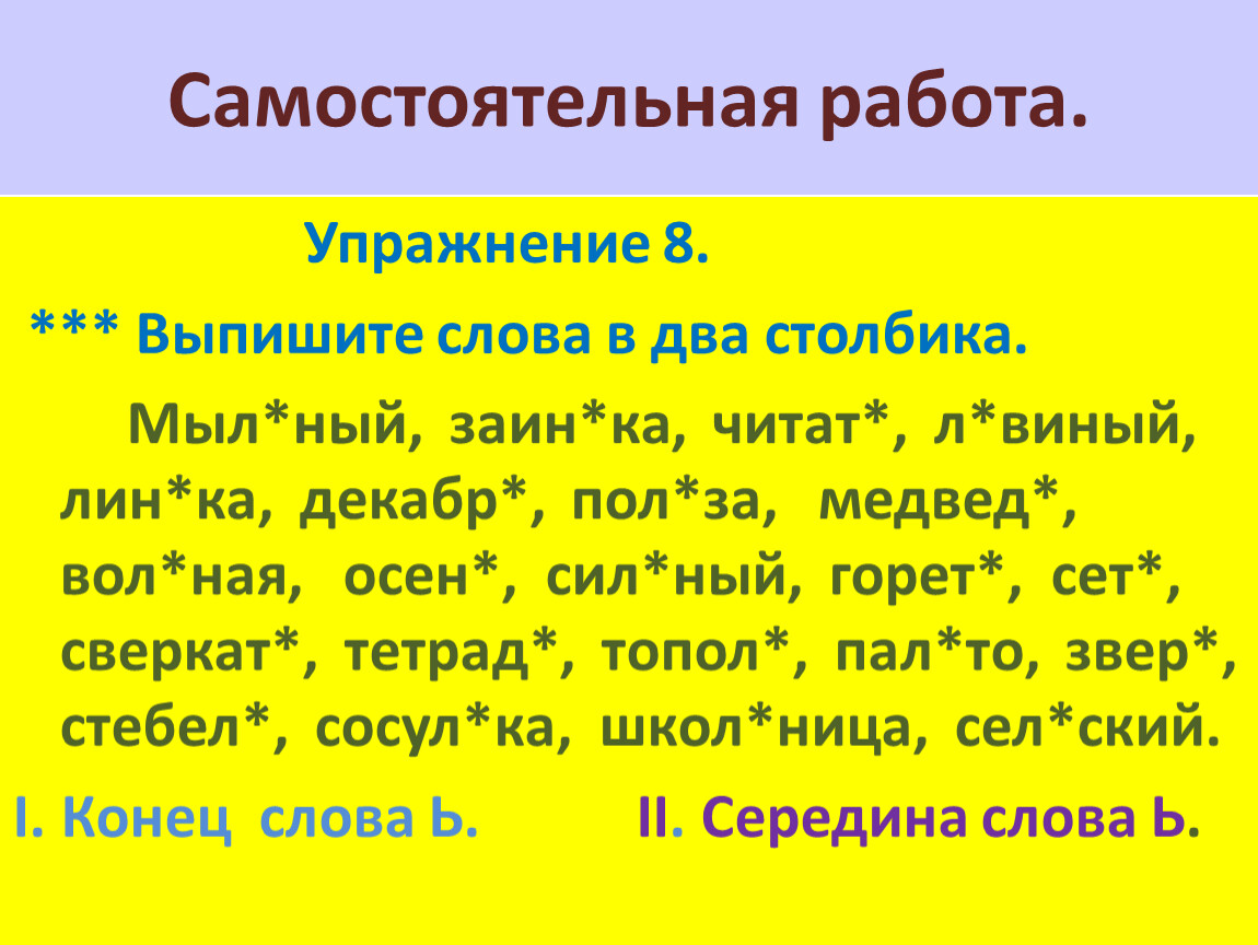 Мыл*ный, заин*ка, читат*, л*виный, лин*ка, декабр*, пол*за, медвед*, вол*ная, осен*, сил*ный, горет*, сет*, сверкат*, тетрад*, топол*, пал*то, звер*, стебел*, сосул*ка, школ*ница, сел*ский.