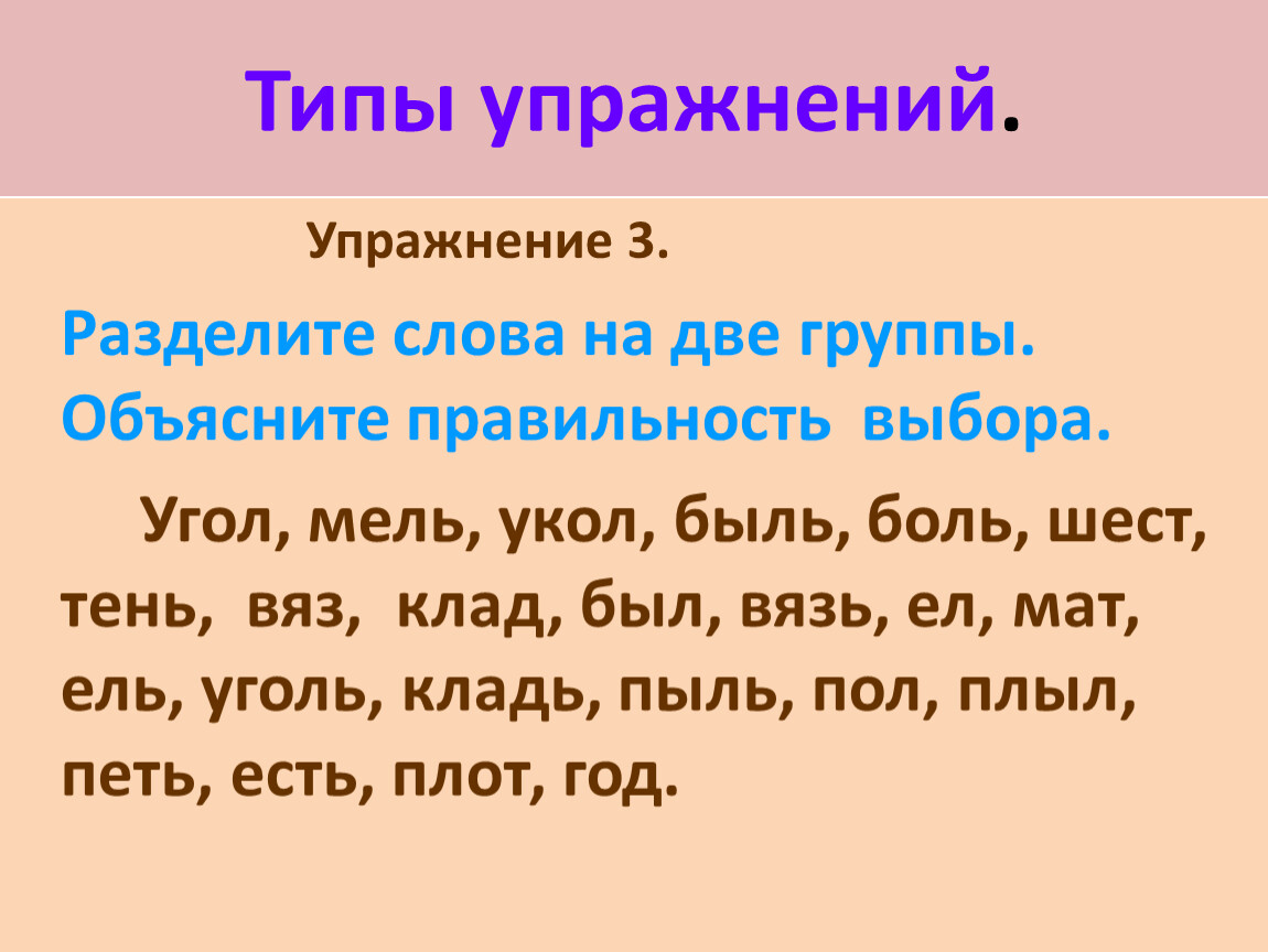 Угол, мель, укол, быль, боль, шест, тень, вяз, клад, был, вязь, ел, мат, ель, уголь, кладь, пыль, пол, плыл, петь, есть, плот, год.