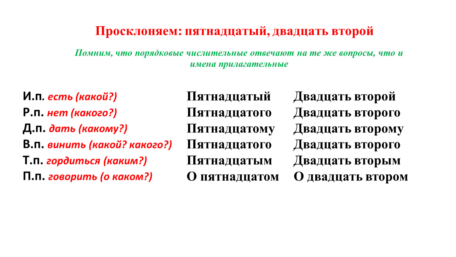Помним, что порядковые числительные отвечают на те же вопросы, что и имена прилагательные