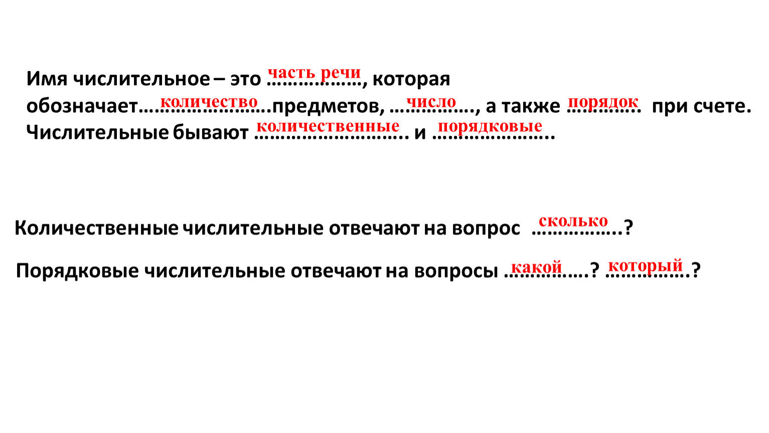Имя числительное – это ………………, которая обозначает…………………….предметов, ……………., а также ………….. при счете. Числительные бывают ……………………….. и …………………..