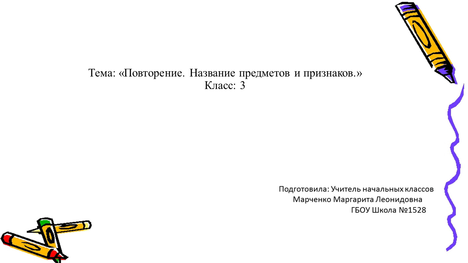 Тема: «Повторение. Название предметов и признаков.»Класс: 3