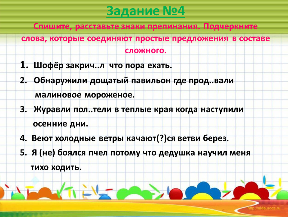 Задание №4 Спишите, расставьте знаки препинания. Подчеркните слова, которые соединяют простые предложения в составе сложного.