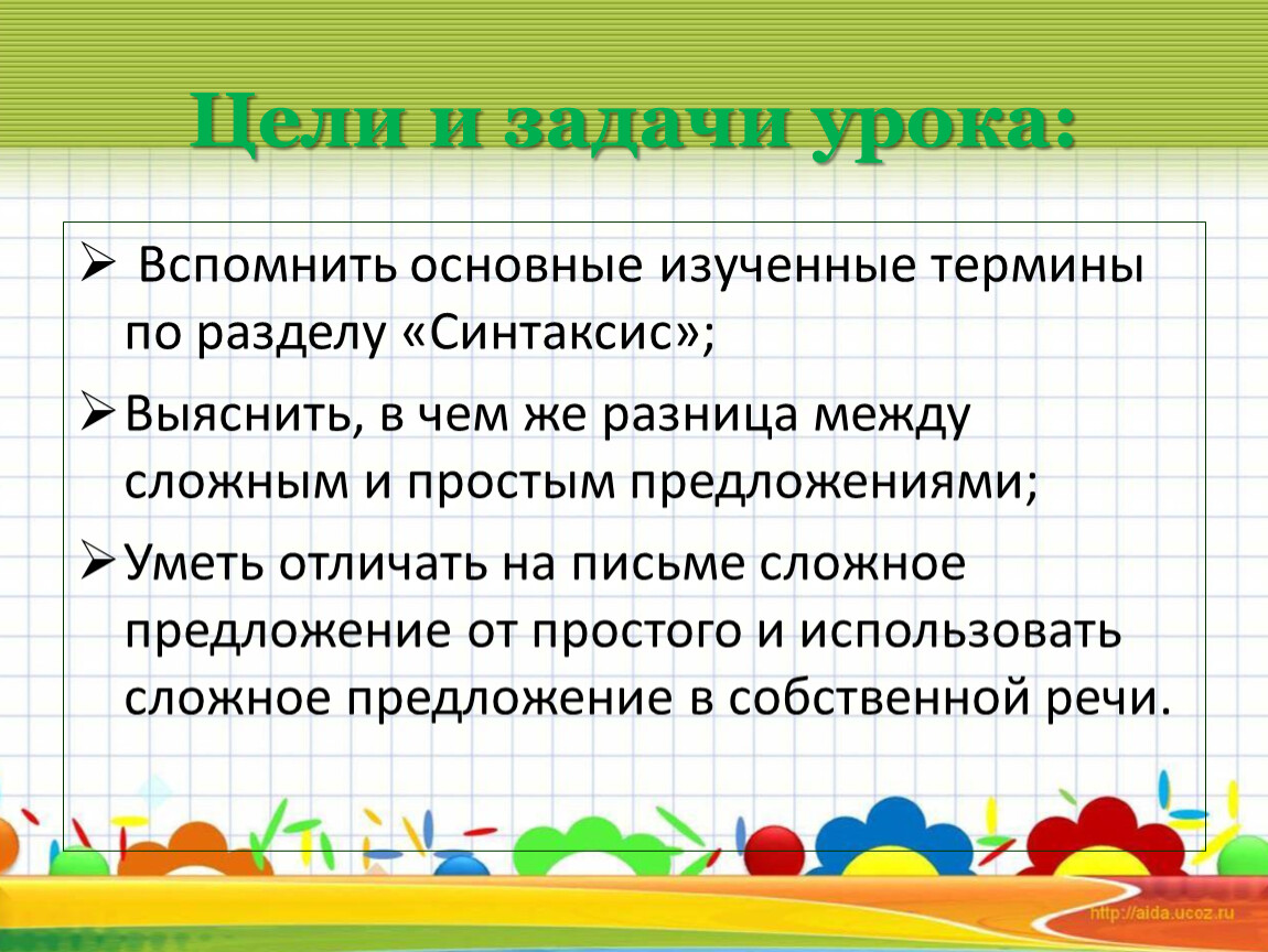 Выяснить, в чем же разница между сложным и простым предложениями;