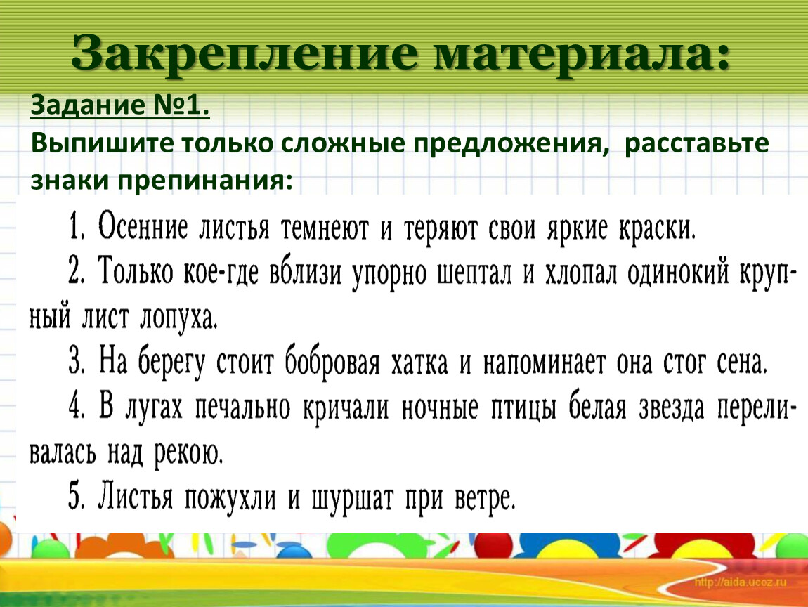 Уметь отличать на письме сложное предложение от простого и использовать сложное предложение в собственной речи.