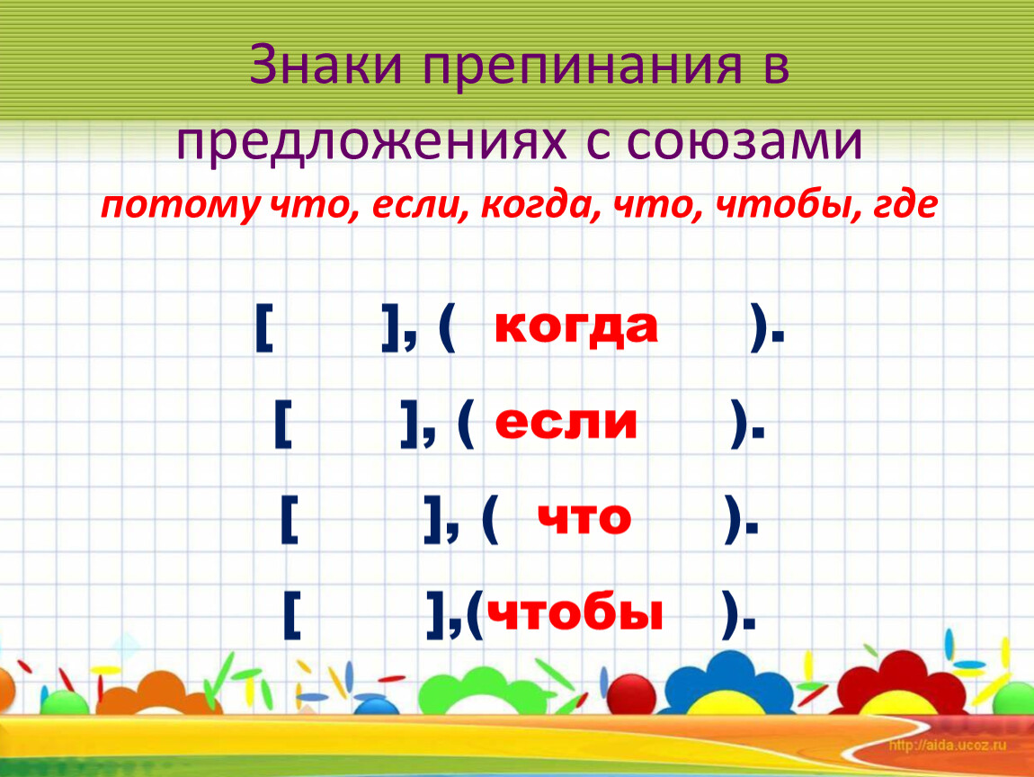 Знаки препинания в предложениях с союзами потому что, если, когда, что, чтобы, где