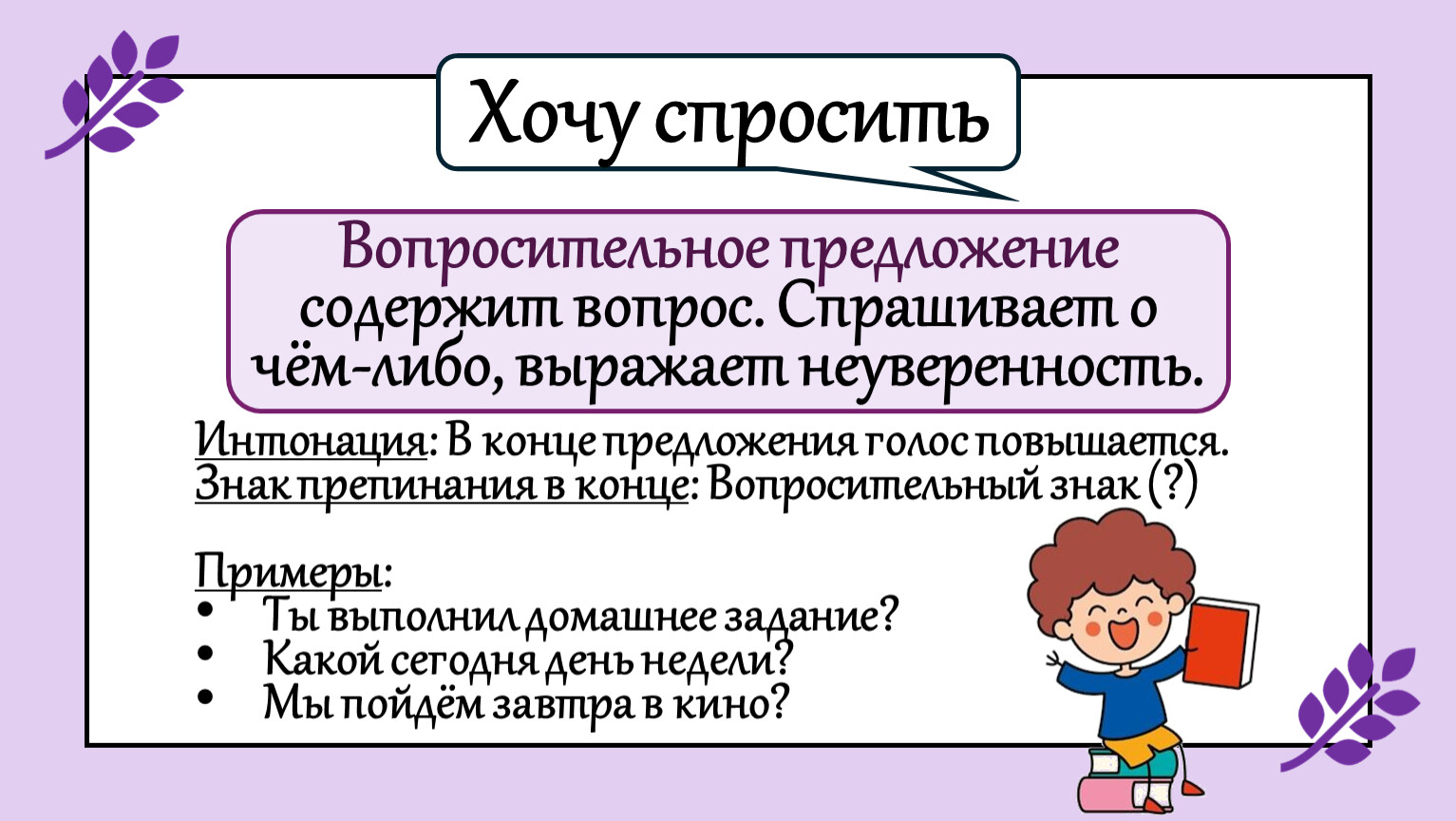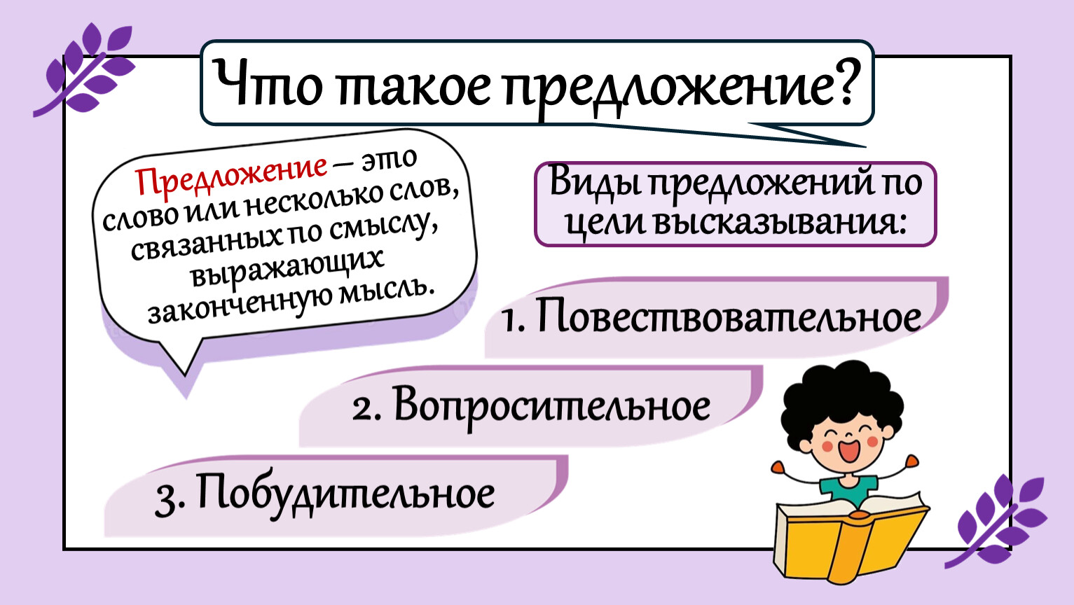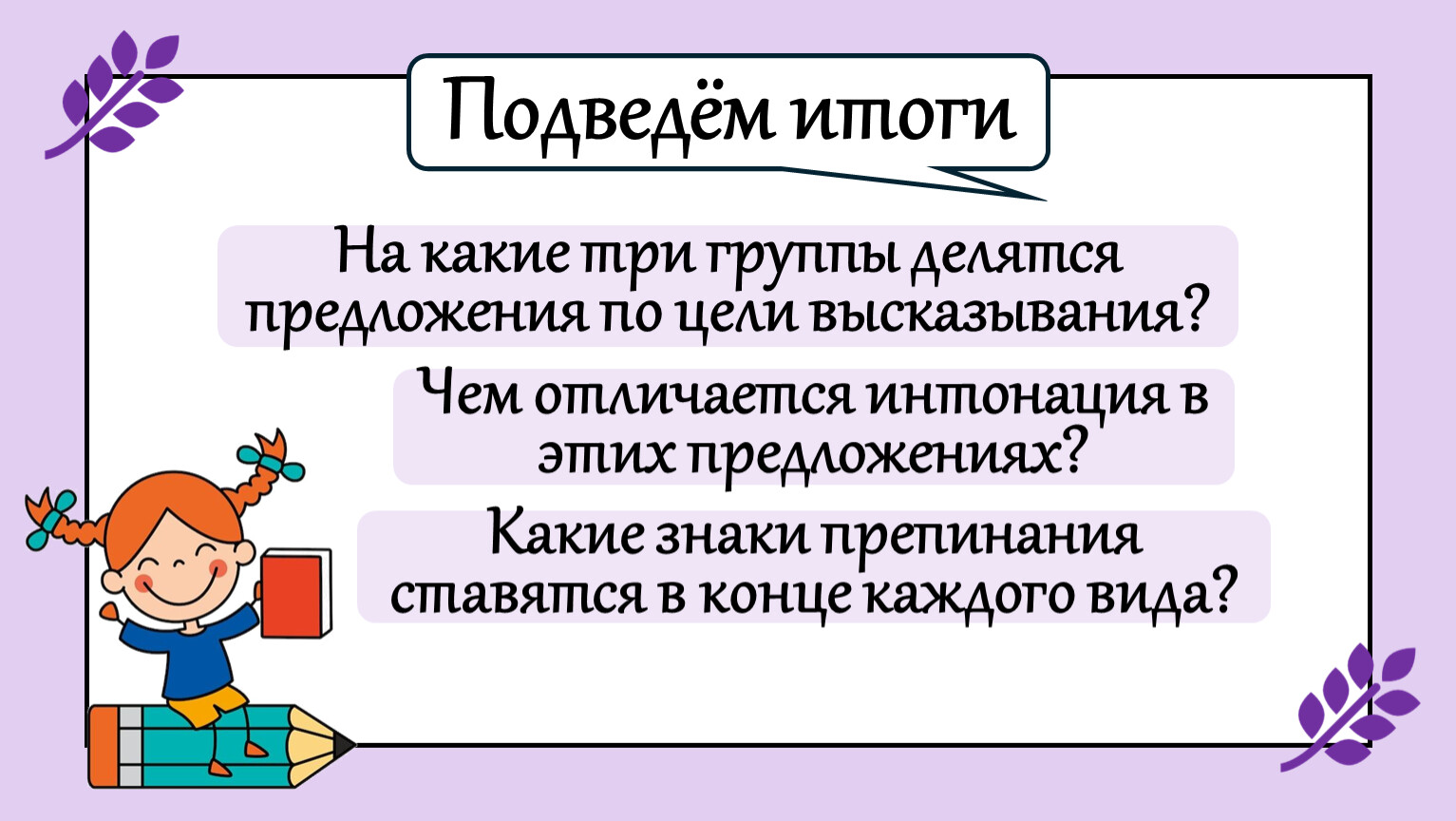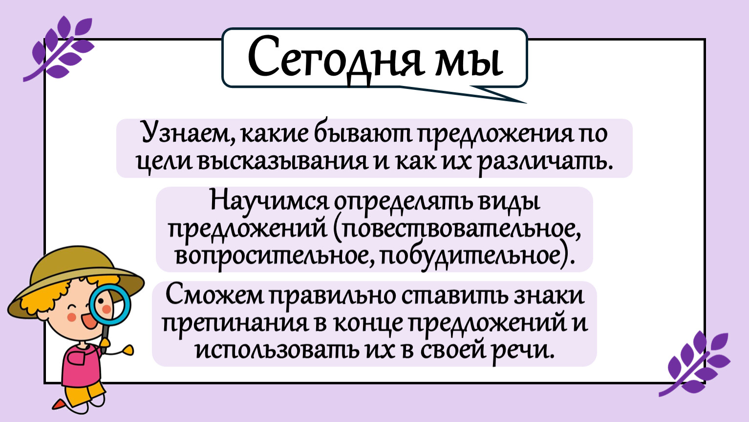 Научимся определять виды предложений (повествовательное, вопросительное, побудительное).