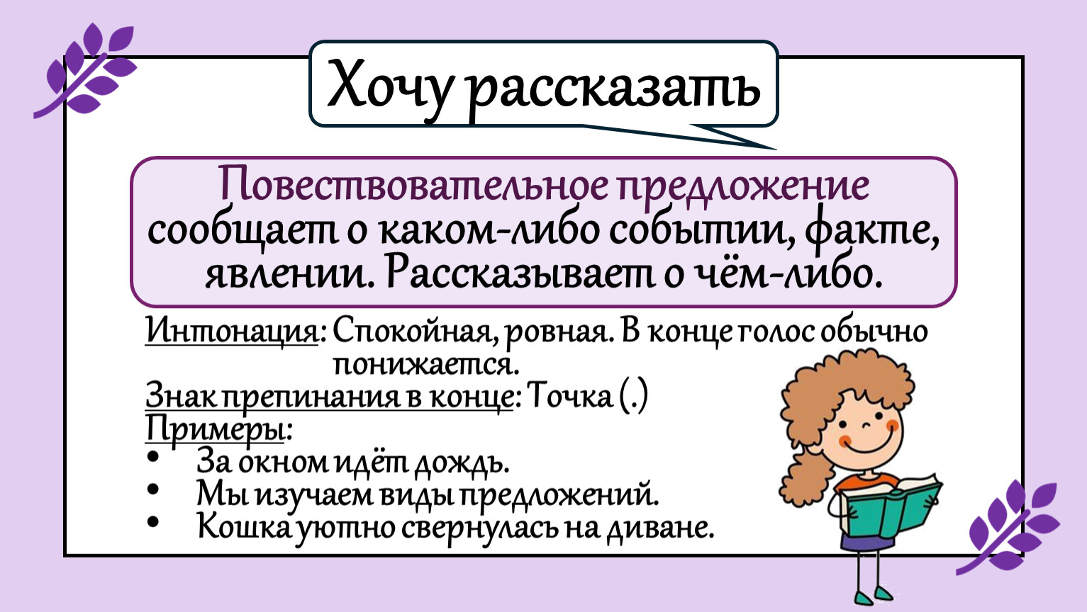 Повествовательное предложение сообщает о каком-либо событии, факте, явлении. Рассказывает о чём-либо.